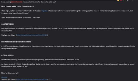 A simple way to summarize active fleet competitions, spotlight Task Force participation, and celebrate recent Action Medal winners. Works well at the start or middle of the week — or even biweekly or monthly.