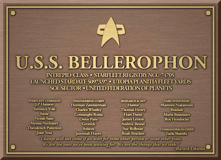 The USS Bellerophon (NCC-74705) is an Intrepid-class Federation starship built in the early part of the 2370s and served with distinction during the Dominion War. After thirty years of various missions within the Alpha and Beta Quadrant, the ship was assigned to the Delta Quadrant to support the Fourth Fleet’s Odyssey Squadron. Sent to undertake a deep space exploration assignment, the Bellerophon was refitted for this mission and to retrace the steps made famous by another Intrepid-class that traversed the same region. The ship’s quote is from a speech shared by the 44th President of the United States of America from Earth’s 21st century, President Barack Obama. Command of the vessel was given to Captain Horatio McCallister in 2399.