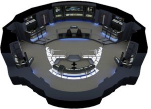 Along the aft wall of the bridge are the Mission Ops panels on either side of the long, wide Master System Display. Next to this, on the starboard side, is the entrance to the main lift, followed by the station assigned to security and tactical. A further door to the captain's ready room exists, following a few steps down. The last station on the starboard side is the engineering console. Next, in front of the command pit, is the helm station in front of the large viewscreen. Finally, the science station is on the port side of the bridge, by the forwardmost bulkheads. Behind this is the briefing room door, while the operations station has the identical setup opposite to the security and tactical station. Between operations and the mission ops area, a small corridor leads out to the rest of deck one, which includes another turbolift and access to the nearest escape pods.