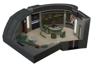 A home away from home, the ready room on the Bellerophon was initially used exclusively by the captain, while Admiral Ross would use the briefing room for most of his meetings. A large spacious area, the ready room on the Bellerophon has allowed for numerous private meetings for the captain and their senior staff or visiting guests. One unique feature is the golden models of previous ships named Bellerophon hanging behind the captain's desk. This includes the USS Bellerophon (NCC-62048) and the HMS Bellerophon. In addition, Admiral Ross gave the ship an antique grandfather clock that now sits beside the replicator as a parting gift.