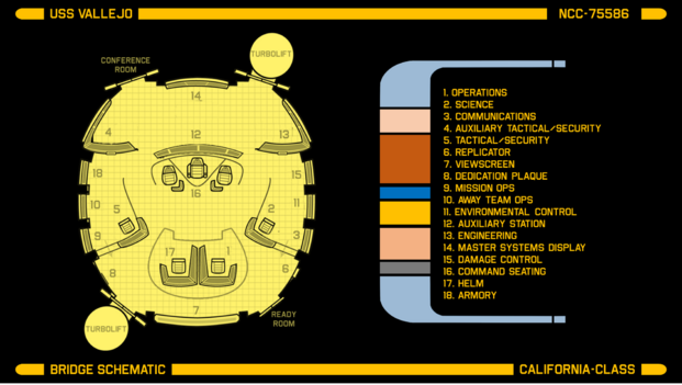 The Vallejo employs the standard California-Class configuration used during its production in 2368. One notable exception is decks one and two. The bridge of the USS Vallejo was heavily modified during her 2401 refit, having lost most of her original first two decks due to damage from a plasma storm. Most components were taken from the USS T'Varra, an early Nebula-Class vessel mothballed at Providence Fleet Yards.