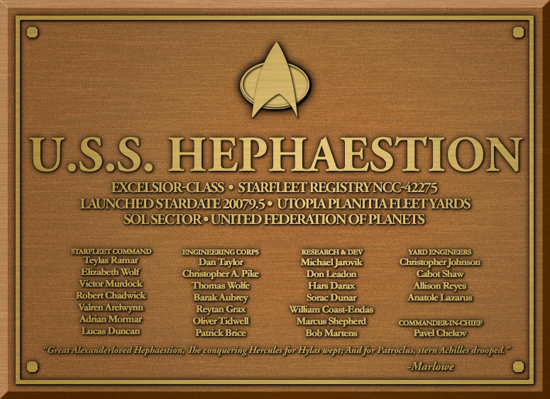 USS Hephaestion was an Excelsior-class starship in the service of Starfleet from the 2340s until her destruction in 2399 at the Battle of Barzan II.
