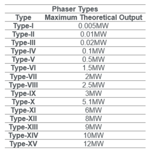 The maximum output for each phaser type is the theoretical limit at which the nadion field would collapse and the phaser would begin to damage itself, but the maximum output is dependent on a sufficient power supply. That is to say that a Type-X phaser on an Intrepid-class light explorer will be substantially less powerful than one on a Galaxy-class explorer because of the difference in their power plants.