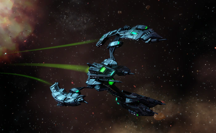 They are built for fast strikes and their weapons are entirely forward facing. The primary energy weapon is a heavy disruptor located on a scythe-shaped extended bow and this is is complemented by two medium disruptors on spurs next to the body of the ship. They are extremely maneuverable, but their aft and side-facing shields are weak, which makes them deadly but fragile vessels.
