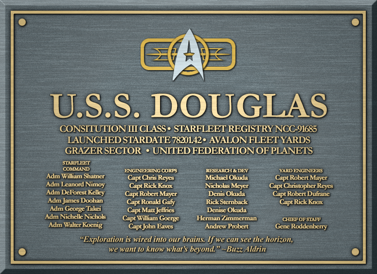 The USS Douglas was named after the preceding Constitution-class USS Douglas NCC-1865 which was active in the year 2256 and experienced action in the Federation-Klingon War of 2256-2257.