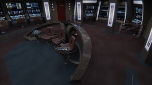 Her primary bridge has taken lessons learned from the original Sovereign-class starships and made valuable improvements to remedy early teething issues with workspace and workflow design. In a throwback to another prior generation, the arch behind the command seats replaces separate free-floating consoles to the rear and either side of the centre seats that had been first introduced on the early ships of the class. This removal of obstacles and centralisation of the primary Tactical station opened up the bridge, giving it an easier flow and roomier feel.