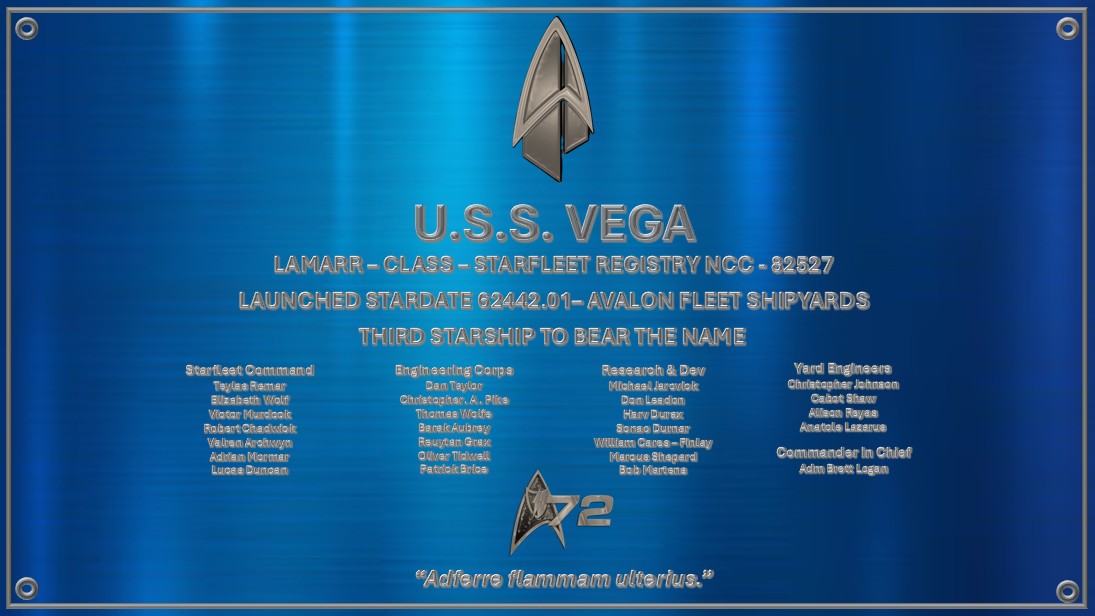 USS Vega (NCC-82527) is a Lamarr-class Federation starship currently assigned to Fourth Fleet's Task Force 72. Tasked with a 5 - year mission of diplomacy and exploration in the Gamma Quadrant, Captain Trevenan Williams and his crew are dispatched to resume tentative efforts to win over new allies from those peoples abandoned in the withdrawal of Dominion forces to thier borders post the Dominion War.
