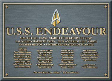 The USS Endeavour NCC-91502 is an Obena Class starship assigned to the Fourth Fleet under the command of Captain Matt Rourke. In late-2399, Endeavour was attached to a diplomatic mission to the Neutral Zone to further Federation interests in the region and develop stronger relations with the Romulan Star Empire and Romulan Republic.