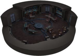 Around the command center, four doors provide access to and from the bridge. On the forward port bulkhead, access is available to the observation lounge, whilst the starboard door grants access to the commanding officer's private ready room (available for use by any officer in command of the ship). At the aft of the bridge, both doors provide access to turbo lifts which enable the crew to access the command center from the rest of the bridge. The starboard turbo lift grants express, overridden access to key locations such as the battle bridges, engineering, shuttlebay 1, sickbay, tactical astrometrics and transporter rooms 1 and 2.