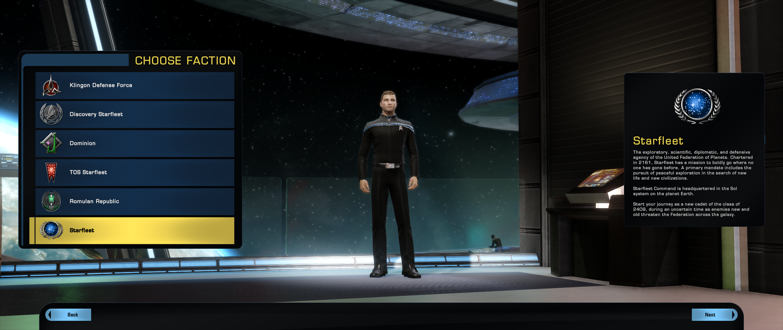 The Choose Faction screen in Star Trek Online, with the 2408 Starfleet option highlighted.