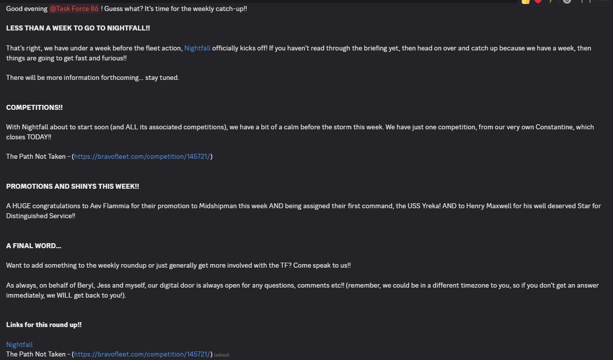 A simple concept highlighting gaming activity within the fleet — upcoming events, what members are currently playing, and notable gaming trends across the fleet. Perfect for mid-week or biweekly updates.