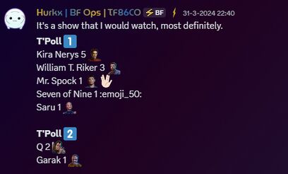 A faceoff style head-to-head of characters or entities (e.g ships) within the universe under the playful idea of Captain 7 of 9 attempting to rank the galaxy.