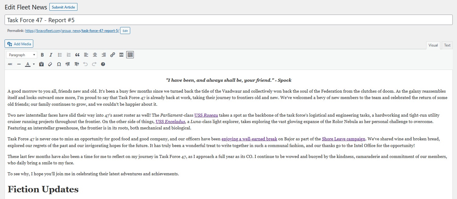 The purpose of the Task Force Report is to give the wider fleet membership a short summary about the activities of the Task Force in the last quarter (approximately). The Bravo Fleet Operations Office will give a schedule via the Discord Lounge, which can move and shift to accomodate campaigns and fleet events.