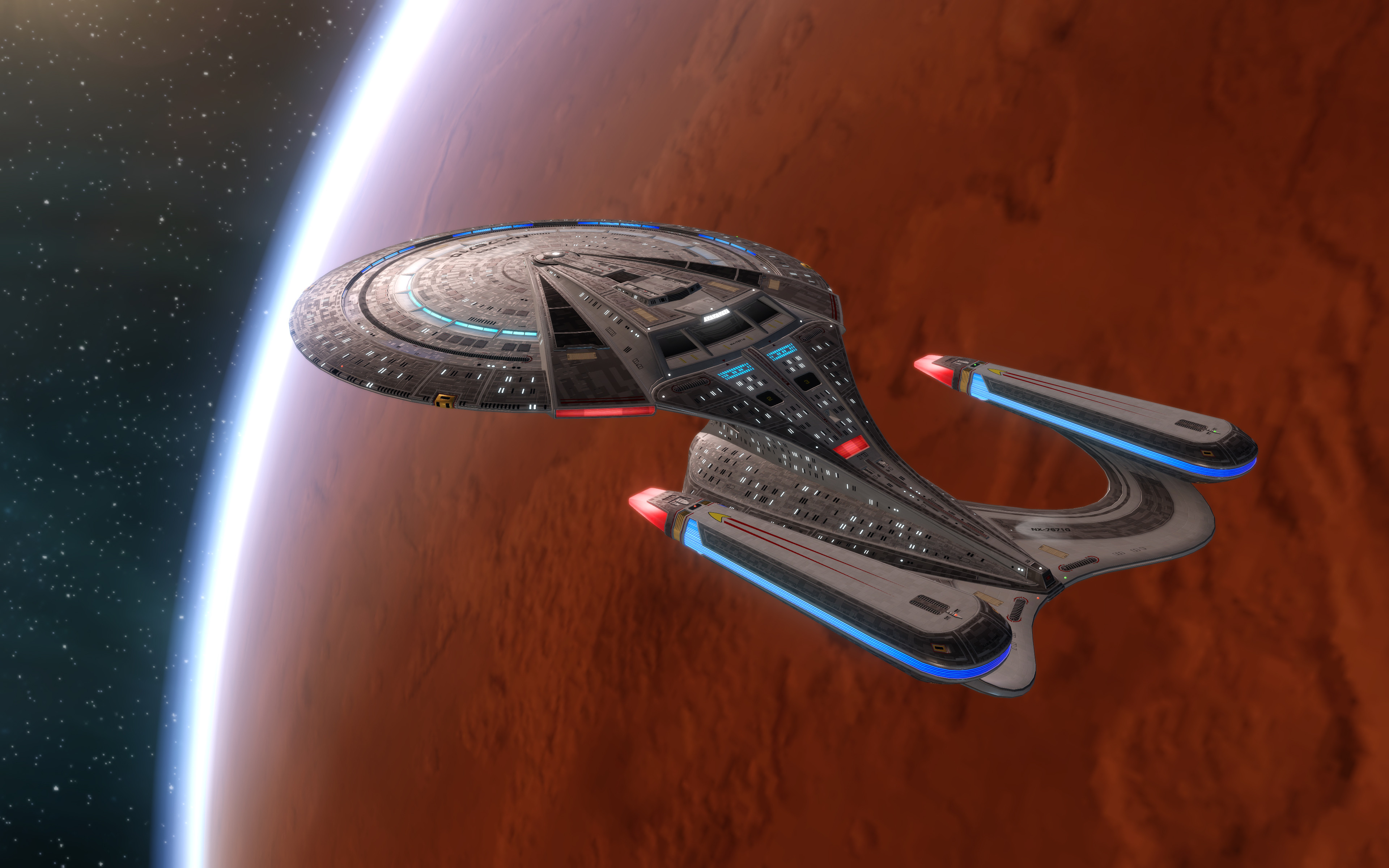 Small craft capabilities exceed the Galaxy’s capabilities by a significant margin, with shuttle bay one being a full fifty percent larger, with three sets of doors that can be operated independently for complex launch and recovery operations. Some of these vessels embark fighters, but most embark a small fleet of runabouts and large shuttles which help the ship carry out its exploratory mandate.