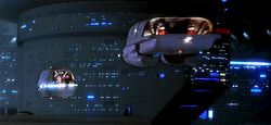 Like its smaller cousin, it has two gull-wing doors above the warp nacelles that lead to a cockpit with two stations, along with aft seating for four, or cargo space. It has an emergency transporter and shielding systems, but it is generally unarmed.