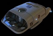 The travel pod was introduced over a century ago as an orbital transfer vehicle. These travel pods are designed to only operate in the orbit of a planet and are not capable of successfully landing on or taking off from a planet's surface. The pod is primarily used for personnel transfer between ships and stations located in a planet's orbital environment but due to the large open area in the pods interior, it can also be used to transfer cargo. Travel pods are boxy craft with a rounded forward end. The forward end of the pod is dominated by a large viewport that gives the pilot and passengers an unobstructed view. The aft end of the craft is taken up by the aft hatch and docking ring. The docking ring allows the pod to dock with the docking ports built into the stations and ships. The pods are equipped with large floodlights along the front end of the pod that were located just below the viewport. The pods are also equipped with an array of RCS thrusters for flight control and also act as the pod's primary propulsion system. The pods had an emergency hatch built into the ventral surface of the pod's hull.