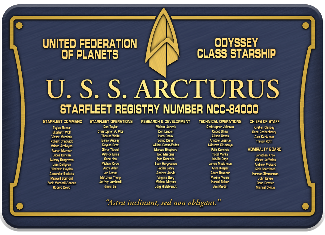 USS Arcturus is an Odyssey-class heavy explorer assigned to the Fourth Fleet under the command of Fleet Captain Michael Lancaster, serving as the flagship for Arcturus Squadron. Designed with higher density fuel storage tanks and hardened systems compared to her sister ships, Arcturus was intended to lead an extended mission in the Delta Quadrant for the Delta Exploration Initiative. Thanks to extenuating galactic events, however, she has spent most of her service life in the Alpha Quadrant, most recently leading exploratory efforts in the remote Olympia Sector out of Olympia Station.