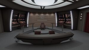 Around the command center, two doors provide access to and from the bridge. On the starboard bulkhead, access is available to the ready room, observation lounge and the rest of deck 1 (including an emergency turbo lift to engineering and sickbay), whilst the port door grants access to the rest of the ship.