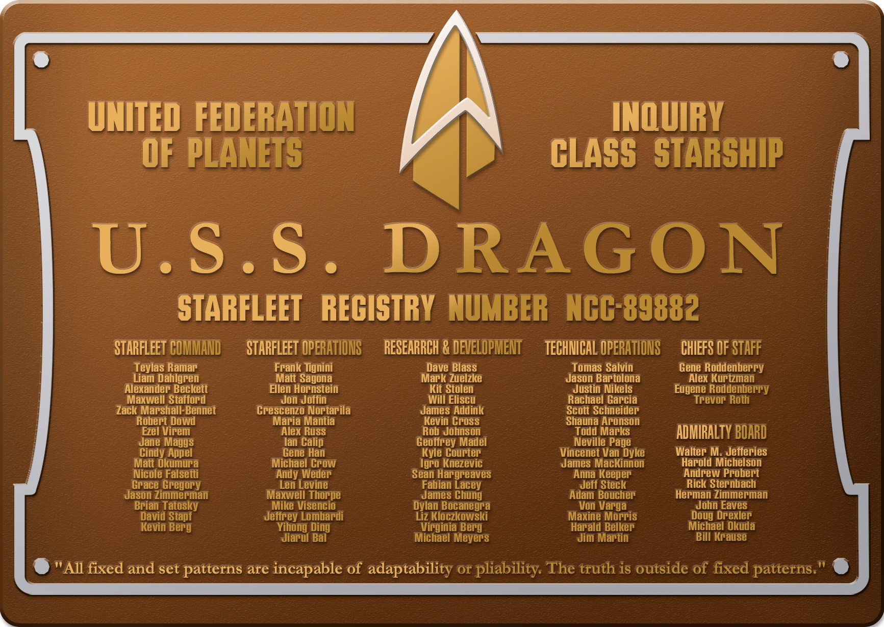 USS Dragon (NCC-89882) is one of the latest block three Inquiry-class ships to enter into service, assigned to Starfleet's Fourth Fleet in Task Force 47. Under the command of Commander Aryanna Rigras since March 2401. The Dragon is an exploratory cruiser with a secondary mission as an intelligence platform for operations in the Thomar Expanse.