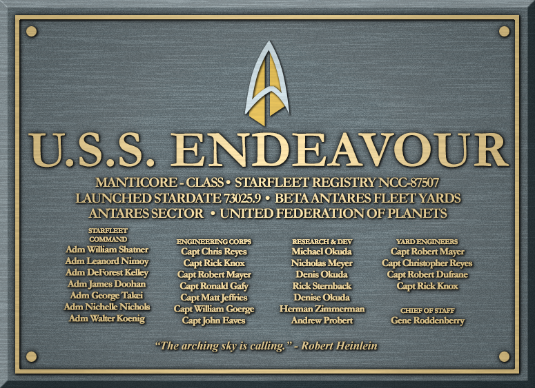 The USS Endeavour NCC-87507 was a Manticore Class starship assigned to the Fourth Fleet under the command of Captain Matt Rourke. As one of the most combat-ready vessels in Starfleet, she was posted to some of the most fraught regions of the Federation in recent history, from The Triangle to the Archanis Sector and the Romulan Neutral Zone on peacekeeping operations. In late-2399, Endeavour was badly damaged by sabotage perpetrated by the Romulan Rebirth Movement, and decommissioned.