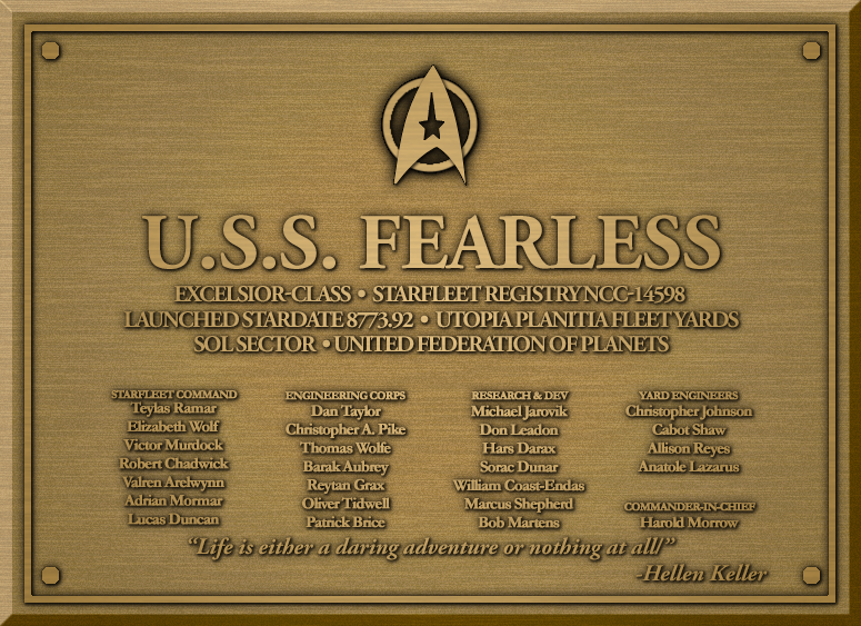 The USS Fearless, is an Excelsior-class heavy cruiser and one of the few remaining still in use. Commanded by Captain Edmond Jermaine Langston, this iconic Excelsior-class, refitted with the Federation’s modern technology, fearlessly continues to be an active presence in fleet operations, primarily in the role of support operations: customs inspection, patrol duties, ambassadorial and flag officer transport, and humanitarian aid; however, updates to weapons systems have allowed the class to retain its function as heavy cruiser allowing the Fearless to function independently for pirate interdiction and other tactical operations.