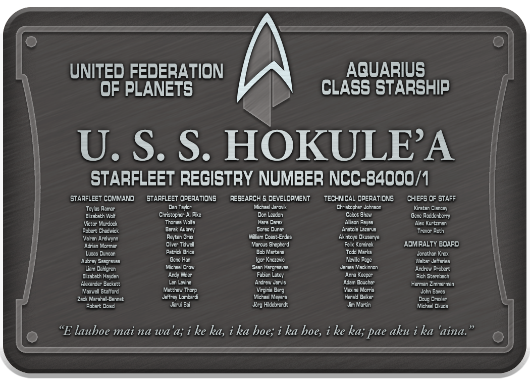 The USS Hokule'a is an Aquarius-class light escort currently assigned to Arcturus Squadron, as the embarked support ship for Arcturus herself. Though nominally commanded by the captain of Arcturus, the actual captain of Hokule'a varies from mission to mission.