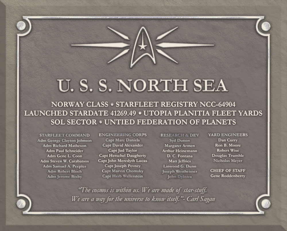 The USS North Sea was commissioned in 2371 and launched in 2373 from the Utopia Planitia Fleet Yards. After an initial shakedown cruise under Captain Donov, the USS North Sea was tasked as a flagship during the Federation-Klingon War. The vessel operated as a mobile HQ for the Federation until the conflict ended.