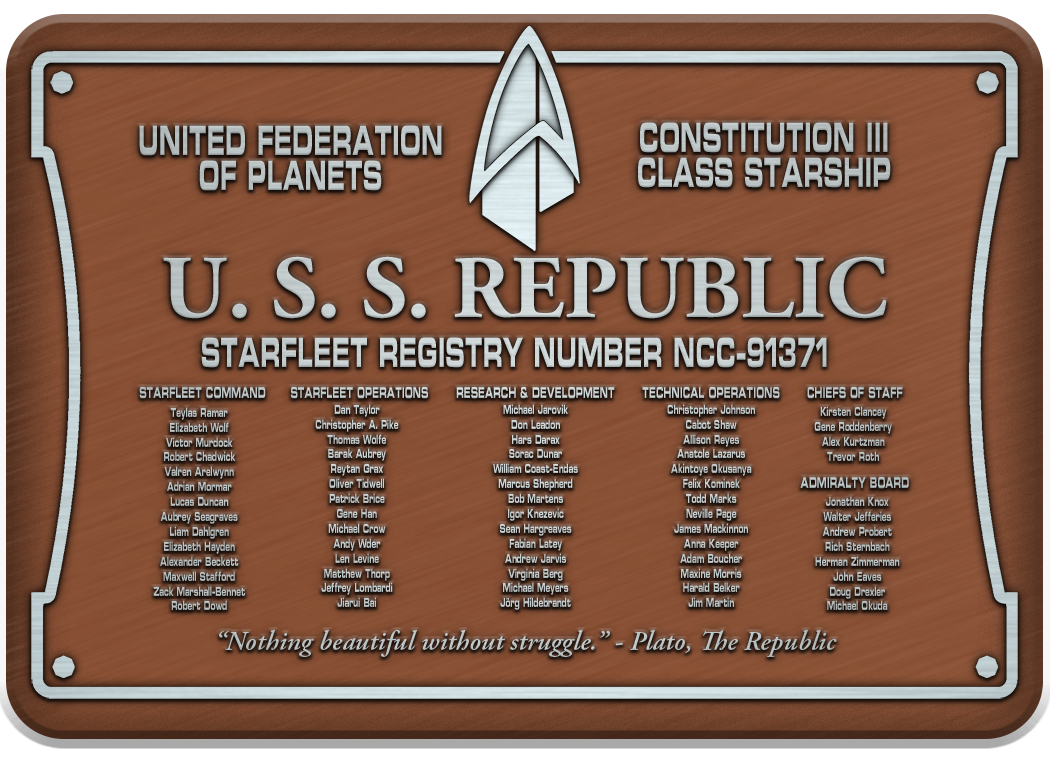 Like other Constitution III-class starships that have been built, Republic has been constructed with a mixture of new and old materials and components as Starfleet engineers make an attempt to bridge the fundamental paradox of the Ship of Theseus problem. As two of the previous starships Republic were museum ships, only artefacts of these vessels have been incorporated into ceremonial components of the ship while the last starship Republic was able to donate a majority of raw materials for the construction of her legacy-bearer.