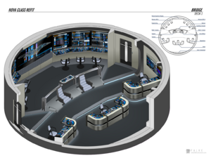 Behind the command platform, on the highest level is a railing bearing the auxiliary controls, a station usually held by a mission specialist. This is the only standing control panel on the bridge. At the very rear of the bridge is the master systems display (MSD) panel, flanked by consoles and controls against the bulkhead. On the right-hand bank the Engineering and one Mission Ops console are set; on the left, Science and a second Mission Ops. Both banks have space for a third crewmember on either side, with custom configurable stations. To the front of these banks are doors leading to Deck 1 on either side of the bridge. Seats are upholstered in a pale blue and dark grey. As with most of the ship, the bridge's deck is carpeted in grey, with the bulkheads and fixtures in grey-brown metal.