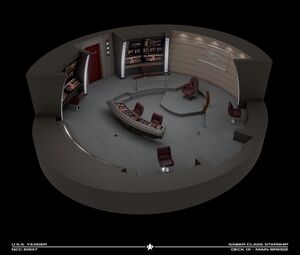 At the front of the bridge was a wide-angled window that filled the forward bulkhead. This window has holographic projectors built into the rim, allowing it to function as a more traditional viewscreen. It can also be used as an emergency evacuation hatch, with force fields being lowered until replaced by a large, external bulkhead. Directly aft of this were the helm and ops positions. Circling the bridge to the port side was a communications station, science station I and II while on the starboard side were engineering and missions ops I and II. Behind the command circle is the primary tactical and security station. Behind it is the MSD.