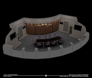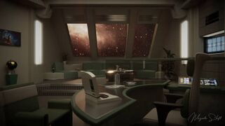 A raised level in the front section of the room featured a small table, a curved couch, and a food replicator. The bulkhead behind the couch featured three large windows facing the starboard side of the ship. An aft-facing door beside the main entrance provided access to a head.