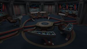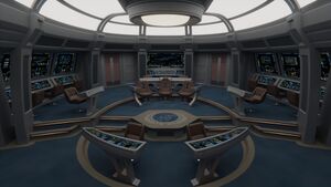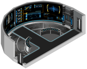 Around the command center, four doors provide access to and from the bridge. On the forward port bulkhead, access is available to the commanding officer's ready room, and adjacent to it, the observation lounge and strategic operations suite. Aft of the bridge, both doors provide access to turbo lifts which enable the crew to access the command center from the rest of the bridge. Either may be overridden for priority access to key locations around the ship.