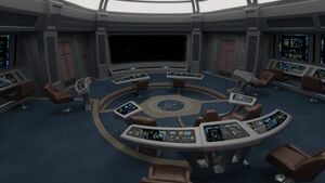 A unique design feature of the Proxima bridge module is the desire to have as many stations as possible facing a single focal point at the heart of the command center. This focal point is the United Federation of Planets logo proudly displayed on the carpeted deck plating, but this is not for purely decorative reasons. The logo actually serves as a holo-communications platform at the center of the bridge, capable of displaying holoprojections of people lightyears away. Surrounding the holo-platform is the standard tri-seat command pit, with seats for the Captain, Executive Officer (starboard) and a third seat (port), reserved for the use of the ship's Counsellor, Chief Medical Officer or any official or dignitary the Captain sees fit to permit on the bridge. Each seat has independent computer controls allowing access to a wide variety of ship systems.
